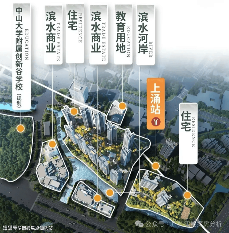 项目北侧配建一所托儿所和幼儿园。西侧教育用地确定规划为中山大学附属创新谷学校,拟定建设总规模为90个班(一个18班小学和一个72班完全中学),预计2025年12月动工,2028年建成投入使用,中学要摇号。项目西北面直线2公里就是中山大学,还有一所私立华海双语国际学校。
