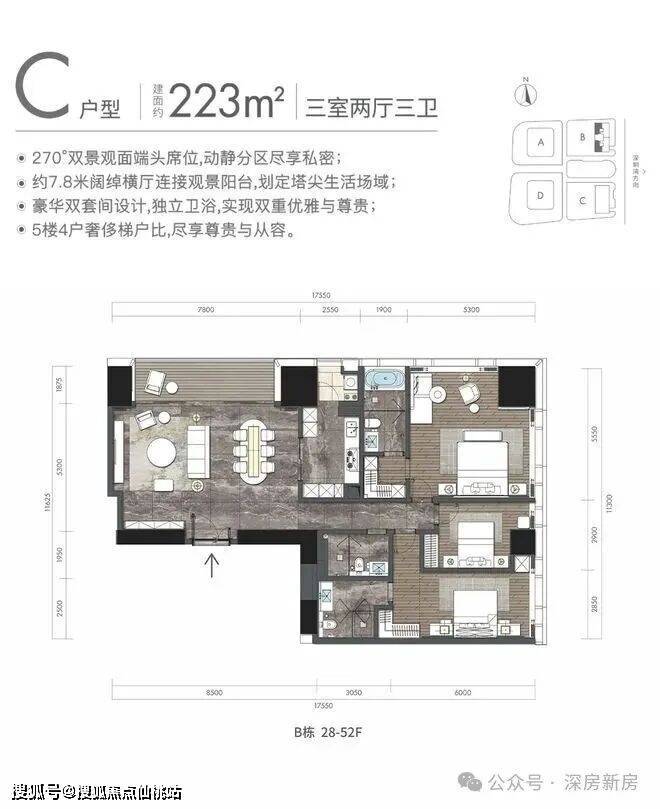 C户型:约223㎡3房2厅3卫:B栋28-52F(高区),东朝向