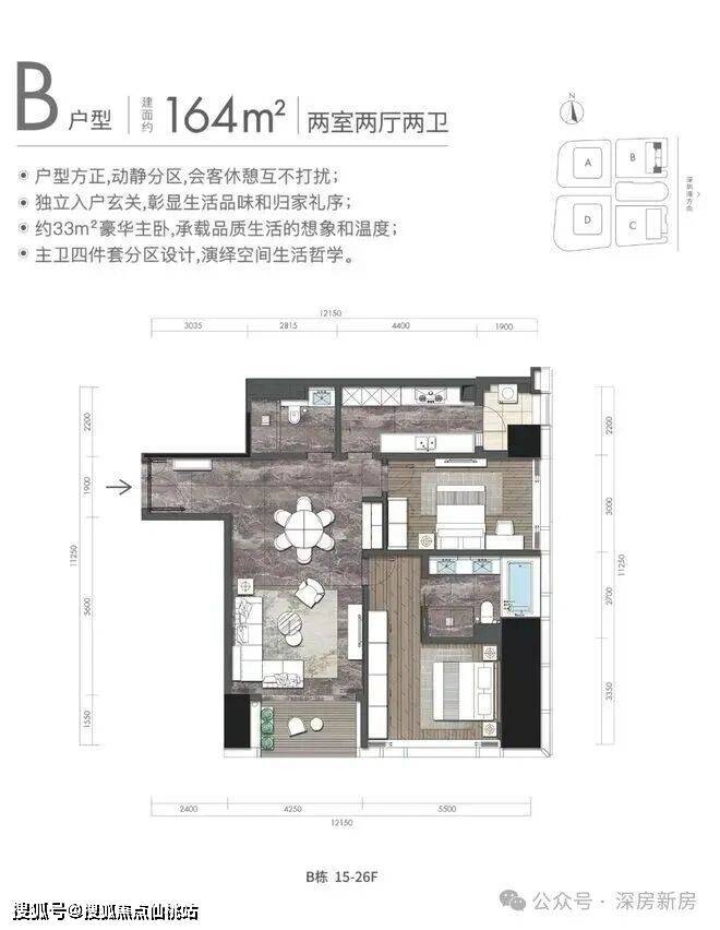 B户型:约164㎡2房2厅2卫:B栋15-26F(中区)端头户型,东朝向