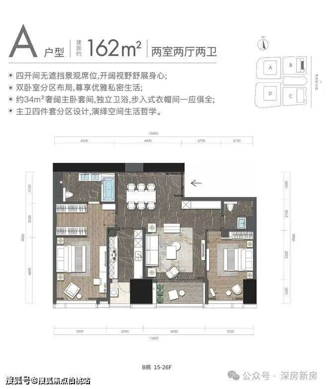 A户型:约162㎡2房2厅2卫:B栋15-26F(中区),东朝向