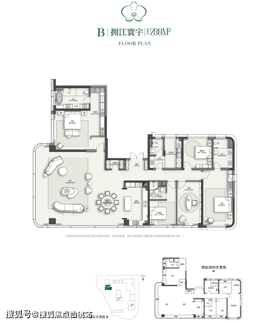 户型设计体现对高端生活方式的深度理解。项目全盘为建面约213㎡~280㎡奢阔大平层,采用2梯2户纯板楼布局。