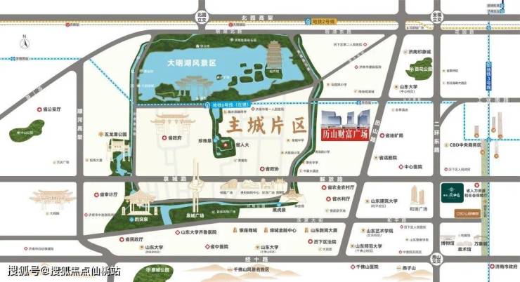 而城发蓝城·凤起历山|历山财富广场所在的古城片区,紧邻大明湖,更是“中心的中心”——北至胶济铁路、南到经十路,西至顺河高架,东到历山路,被誉为“老济南”的缩影,承载着济南的起点和根脉,每一寸都浸透着时间的醇厚价值,是真正的寸土寸金。