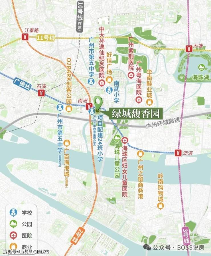 道路交通:临近工业大道、南洲路、广州大道、洛溪大桥、海珠湾隧道(在建)等交通干道,后期海珠湾隧道建成后 15 分钟可直达广州南站,享 15 分钟珠江新城 / 琶洲双 CBD 生活圈。