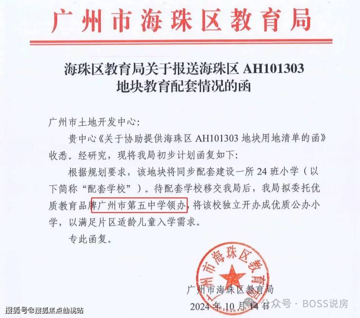小学方面,项目将配建广州五中教育集团领办的 24 班广州五中附属实验学校(小学),在拿地的时候就有官方文件确定!