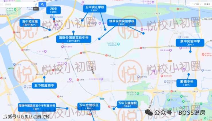 对口的初中属于海珠区第 5 组摇号,对应学校有广州五中、九十七中、四十一中校本部、江南外国语、蓝天中学、东晓中学和劬劳中学等省一级学府,形成从幼儿园到高中的全龄教育矩阵。