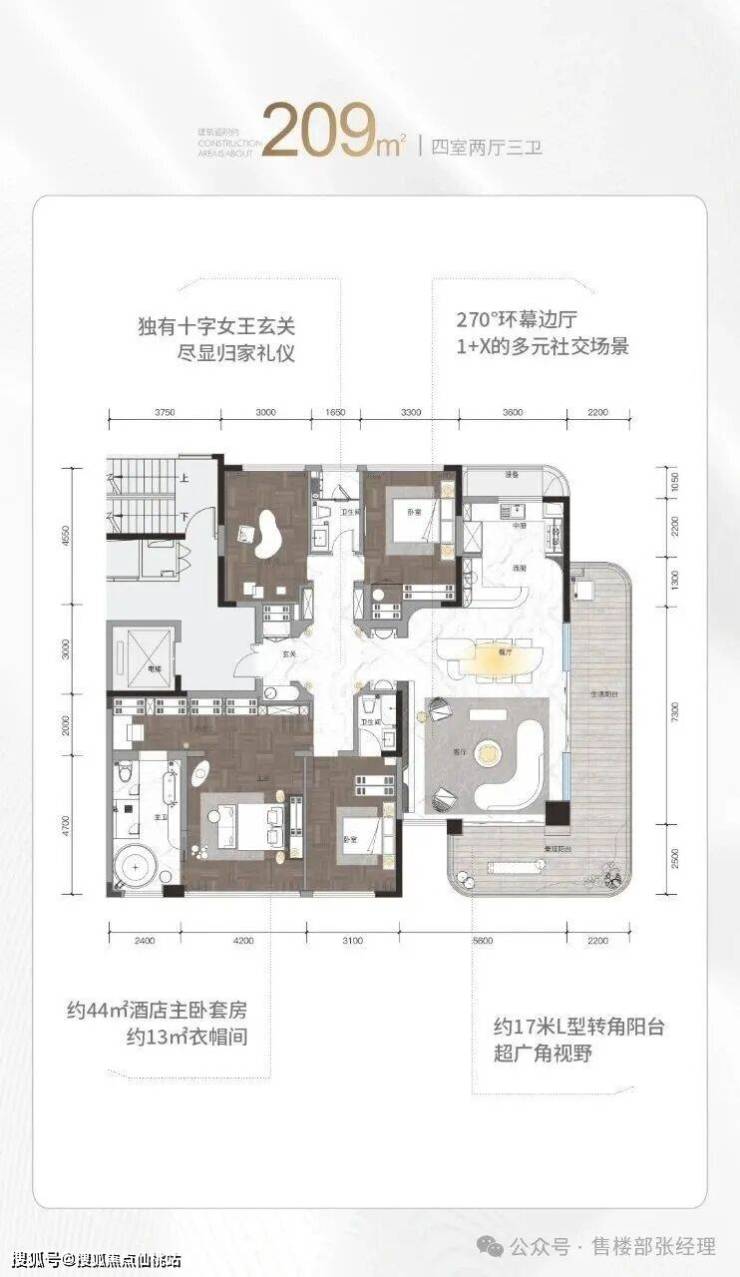 209户型:南北通透双阳台,四房两厅三卫,209平只做四个房间,一进去就两个字:豪横! 这才是改善该有的气派。