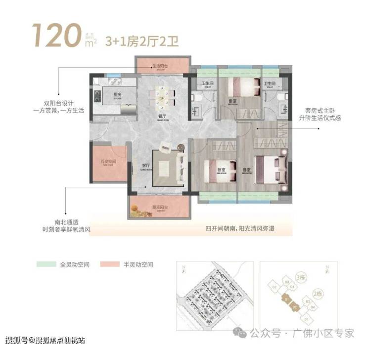 双阳台+阔绰双厅南北通透,四开间朝南,套房式主卧更多生活仪式感