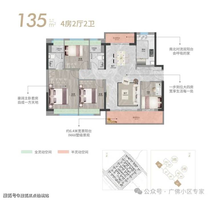 约6.4米墅景阳台+双阳台+阔绰双厅南北通透,四开间朝南,套房式主卧更多生活仪式感