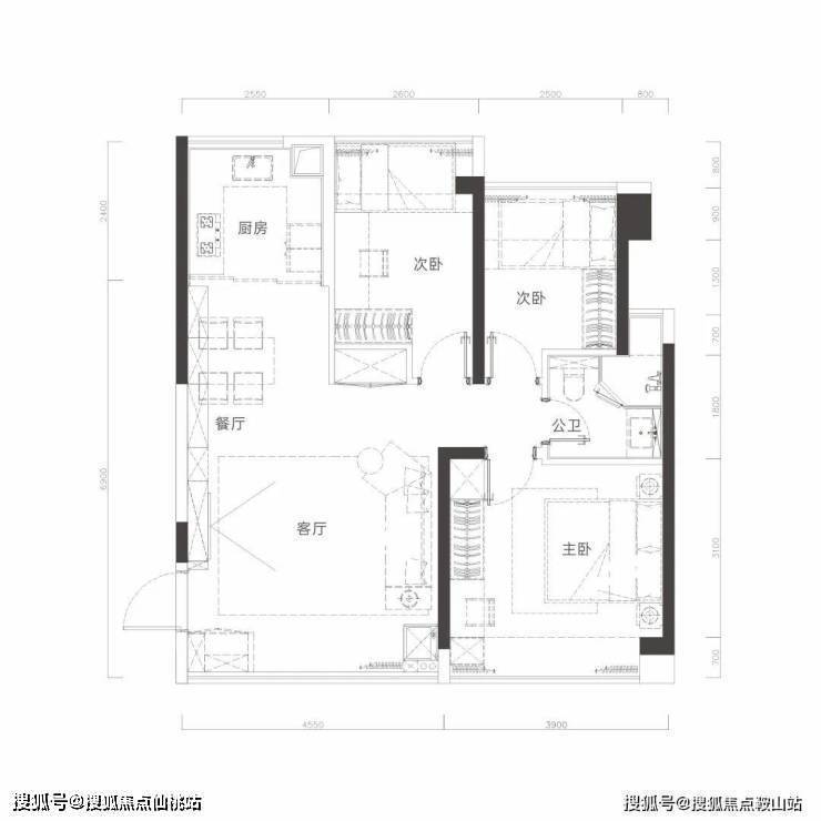 人性科学动静分区,休息待客互不打扰;约3.8m面宽主卧,主次卧带飘窗。