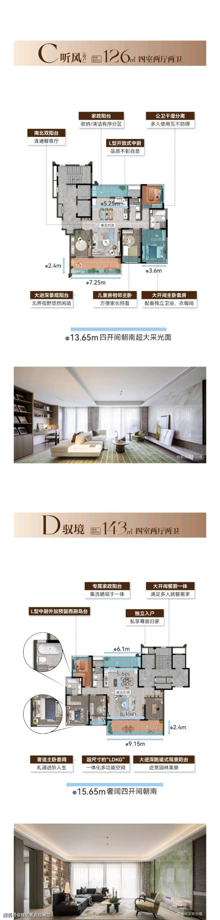 •南北双奢阔观景阳台 引领雅致新生活项目规划建筑面积约103-143㎡改善户型,层高最高约3.05m,南北通透、双景观阳台、南向多面宽,于一方宽境里,满足对阔绰空间与舒适格局的拥享。