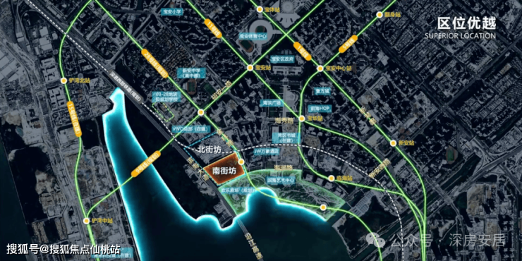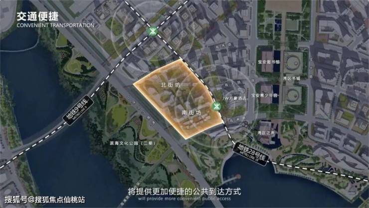 南街坊地块位于宝安中心区,紧邻沿江高速,坐拥湾区书城、湾区之光摩天轮、青少年宫、图书馆、滨海演艺中心、欢乐剧场等市级文化地标,与腾讯全球总部企鹅岛仅一水之隔。