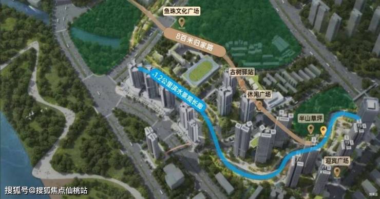 休闲方面,项目巧妙地借助休闲步道和立体连廊等设计,将狮山公园、蟹山公园、瓦壶岗公园串联起来,形成一个“三山一水”的自然景观格局。另外还将打造1.2公里滨水水景园林,打造樱花水岸及夜光跑道,与外部的公园、山景与江景相得益彰,共同构成了一个立体生态的居住环境。