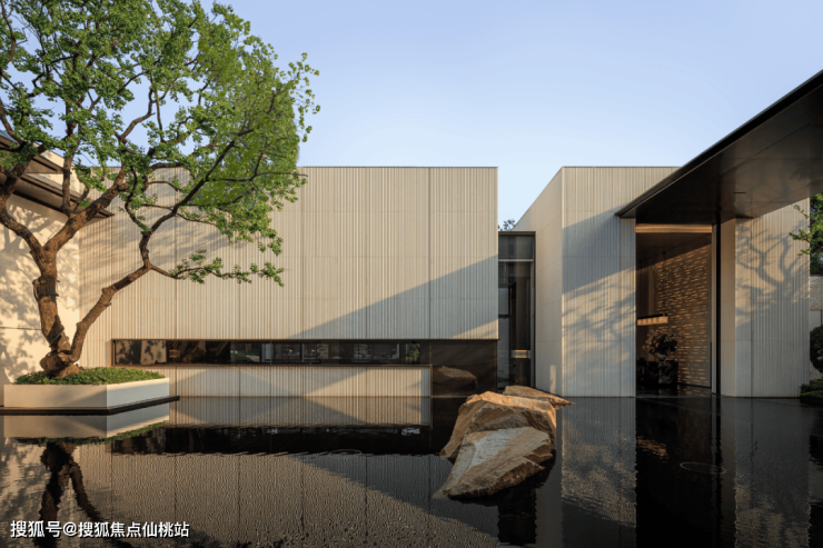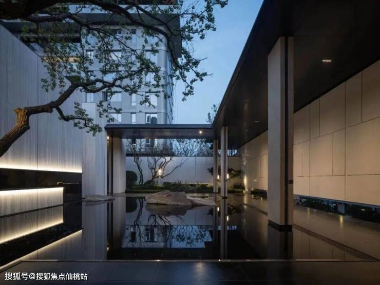 穿过会所,便达中心水院。连廊的进退、水面的镜影、墙的肌理与地面的纹路,以线性韵律将空间串联成诗。归家动线不再仅是路径,而是步移景异的视觉叙事。
