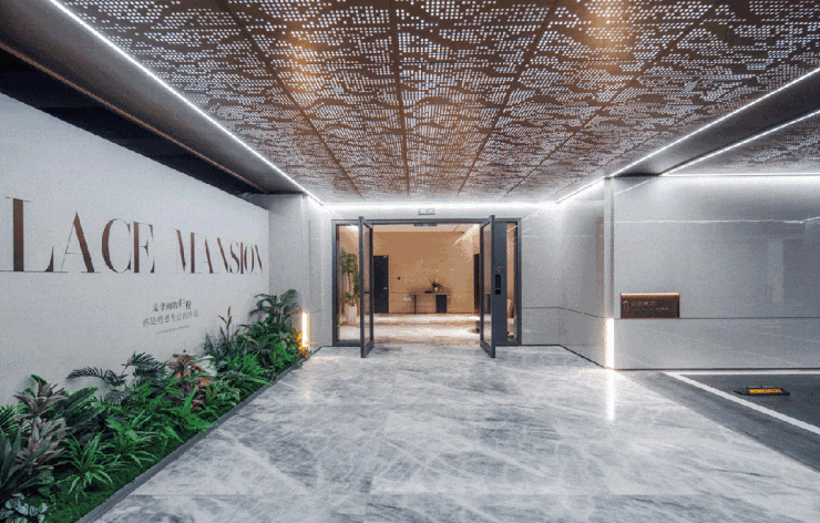 入口两侧的迎宾屏风,以多扇 弧面向外 舒展,能让你瞬间从城市喧嚣切换至静谧社区。
