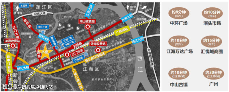 江门大道作为江门重要的交通干线,往北可至蓬江、鹤山,南可至会港大道快速抵达江门站,通过江门站可实现湾区一小时生活圈。