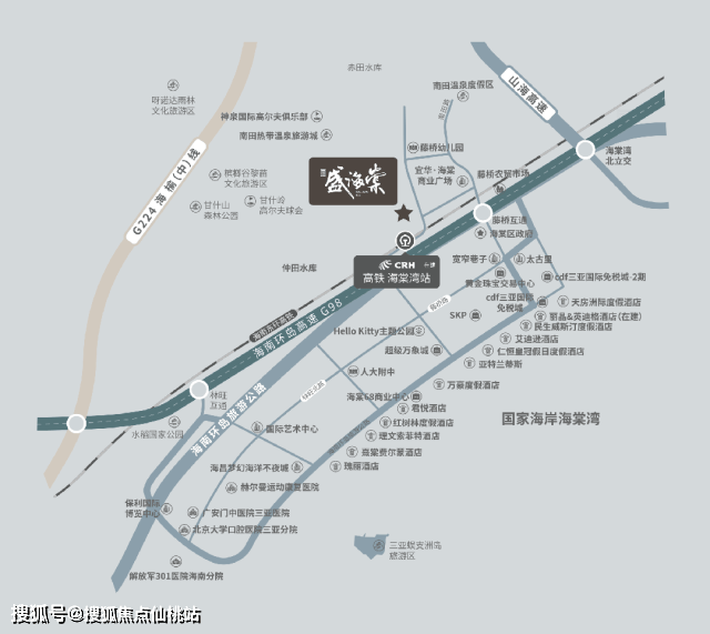 立体交通距三亚市中心约28km、海棠湾高铁站(规划中)约2km、三亚凤凰国际机场约35km