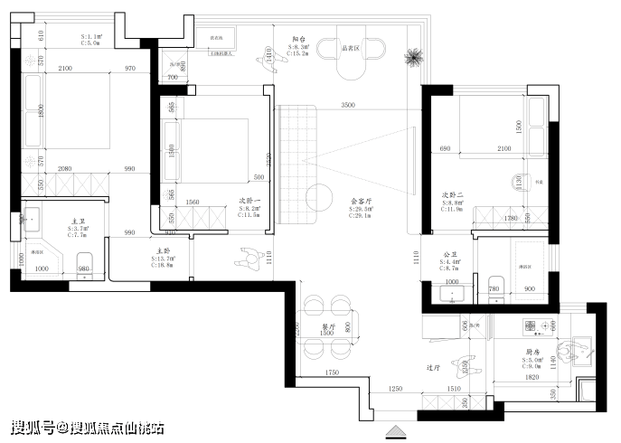 本户型原始布局偏空旷,设计师对此做了核心优化。先划分出主次卧、客餐厅等功能区,在南向区域打通主卧飘窗,借助充足采光让主卧兼顾休憩与办公的舒适体验。再优化餐厨衔接动线,增设公区提升使用效率。同时,规整过道动线,让原本的空间转化为功能清晰、动线流畅的宜居布局。