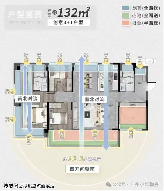 同面积段中罕见四开间朝南,南北通透,沐光格局