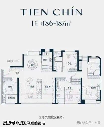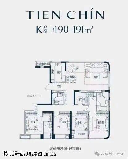 •145-191㎡四居(主力户型):南北通透,餐客厅一体化,南向面宽达14.7米,客厅配全景落地窗,主卧套房设计;