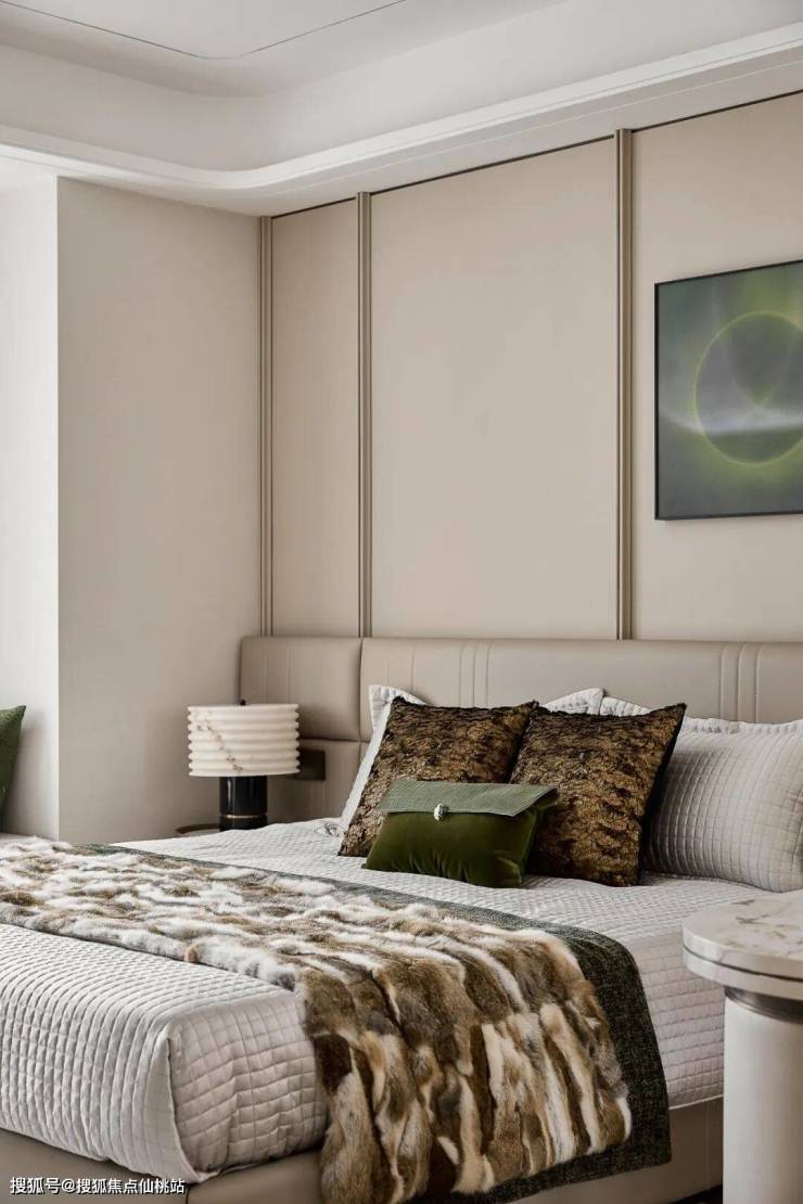米灰软包墙围裹着松弛的气息,床头的绿调画作似揉进了森林的晨雾,与抱枕的墨绿缱绻相拥。仿佛时间在此停驻,只留与自己相处的松弛与美好。