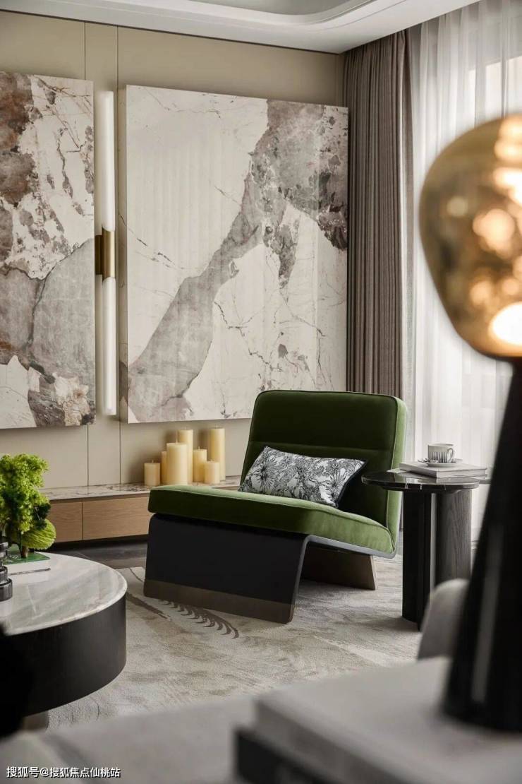 以大理石的冷冽肌理、皮革的温润触感、金属的利落线条,编织出空间的精致骨架。每一寸材质的碰撞,都像是特写,大理石的天然纹路是时光镌刻的诗行,皮革的细腻褶皱藏着岁月的温度,金属的冷光则勾勒出现代生活的利落锋芒。