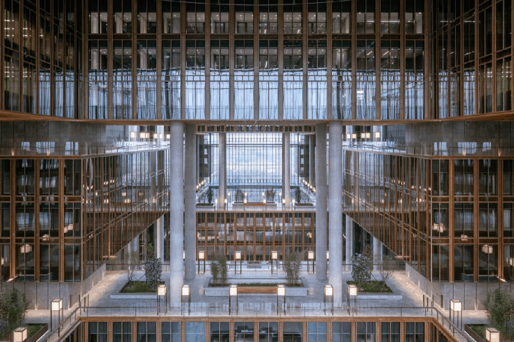 项目办公塔楼,拥有全玻璃幕墙的立面,线条简洁流畅、轮廓硬朗大方,融合现代光影美学与建筑美学,形成清晰凝练的水平肌理;刻画了大厦的整体造型——“多根筷子”聚合之势,优雅挺拔,和而聚力,矗立在深南大道一线,彰显垂直总部的地标形象。