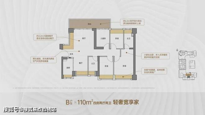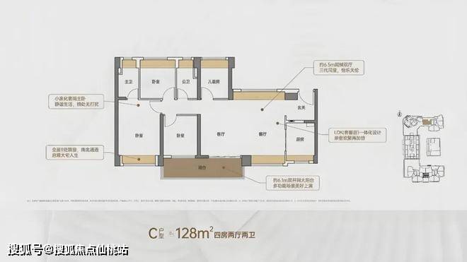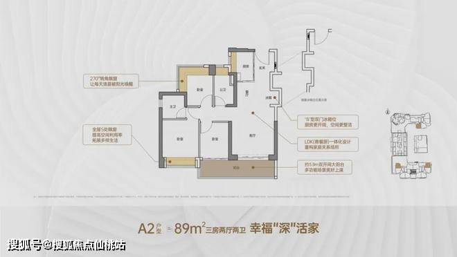 竖厅格局,客厅3.5米开间,LDKB一体化,S墙设计预留冰箱卡槽位,客厅连接次卧出5.9米长的大阳台,主卧双面飘窗,次卧270°转角飘窗,全屋6面飘窗,U型厨房,卫生间干湿分离。