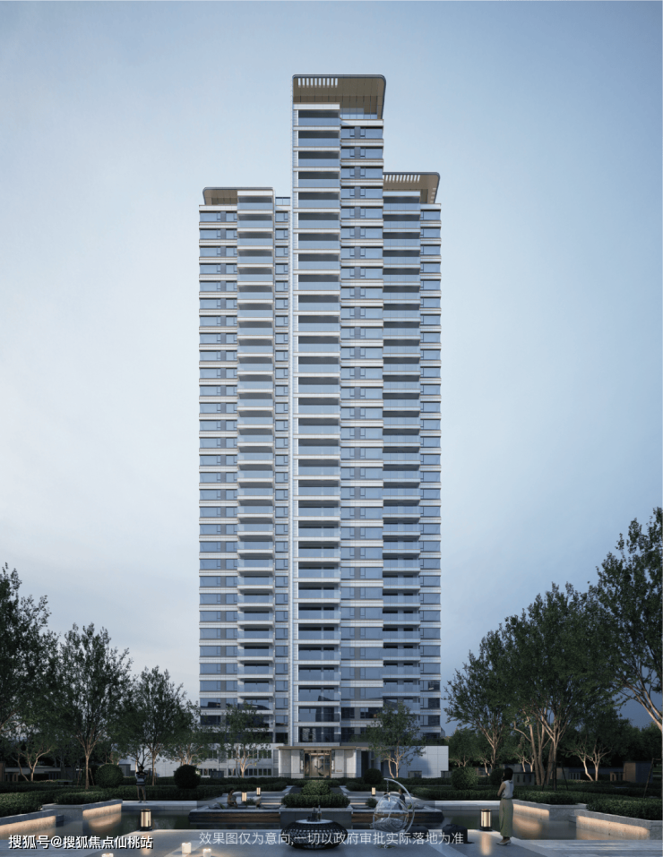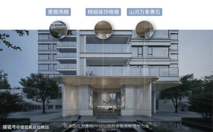 超高窗地比、全面屏的设计、柔和色调中的艺术气息,让整个建筑瞬间变得通透轻盈,在保留了建筑外立面优雅、沉静气质的同时,勾画出简洁轻奢的外立面。首层5.4米入户门庭,高台宽檐,精工材质搭配,强化“高门阔府”的仪式感。