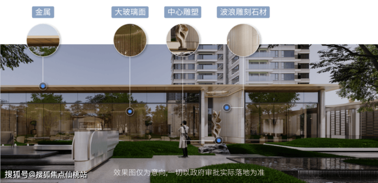 在近人尺度的基座表皮上,通过石材与金属铝板的碰撞,并结合柔和的弧线外立面设计,拥有更好的比例、艺术性与美感,使其在众多建筑中脱颖而出,纯浅色立面效果为建筑物增添独特的魅力。
