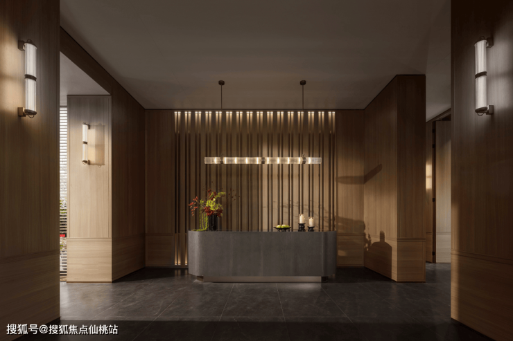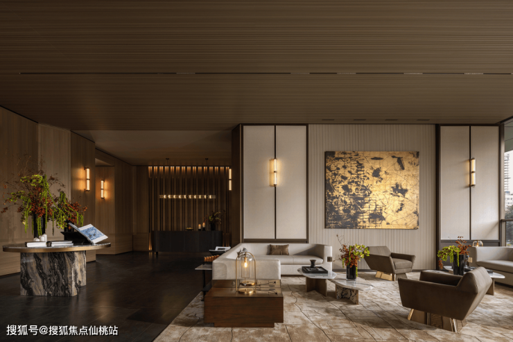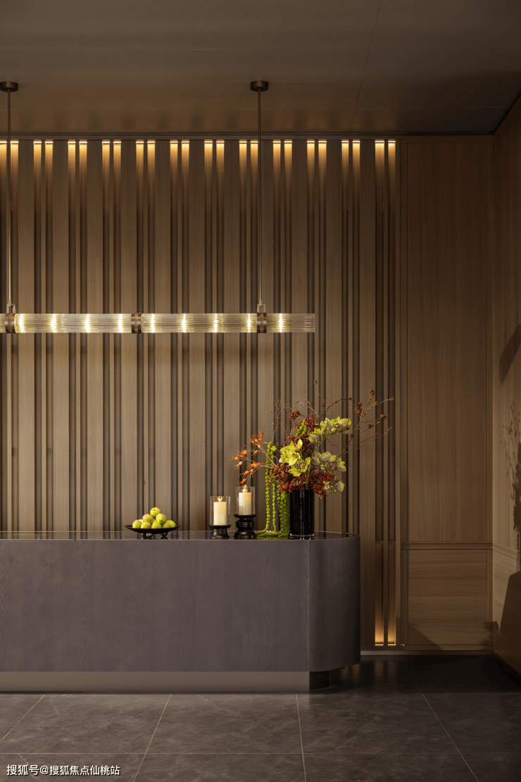 从电梯厅转入到会所空间,接待区域以简洁的立面,高挑的空间尺度,呈现出纯粹的美学。木材的温润与石材的细腻,共同营造出优雅以及大气的氛围。台面那一盏金属台灯,点亮了归家的帷幕。