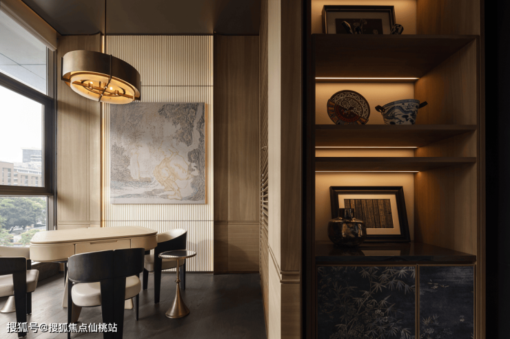 空间布局延续“留白”哲学,家具线条简约而不失精巧,金属细节与木质温润质地形成内敛而富张力的视觉平衡。