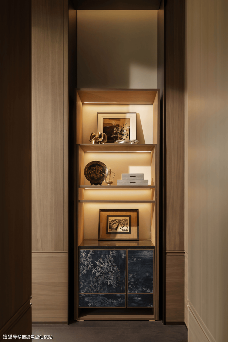 木作展示柜犹如一个静止的舞台,嵌入式灯光精确勾勒出艺术品的细节与质感——无论是东方陶瓷、漆器盘,或是雕塑、画框,都被赋予了艺术般的美感。