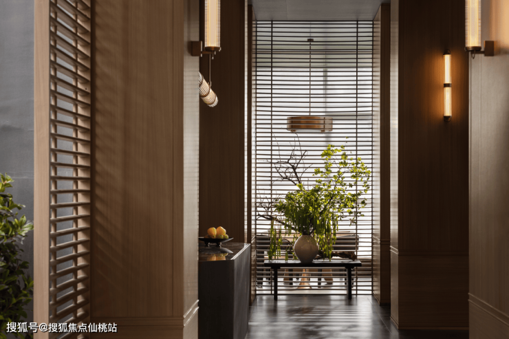 根据动线的规划,设计在空间中多处设置造景:木格栅廊道搭配花艺装置;茶室以及休闲区旁的枯山水造景;化用园林营造句法和意境氛围,在方寸之间延伸平远意向。