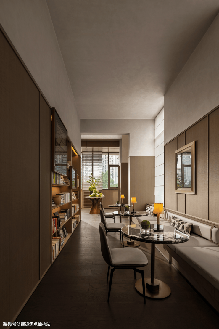 休闲区以围合对称式布局,构建了个开放式场域。营造了一个可阅读,可休憩,社交的一方场所。浅色立面淡雅明快,融合现代艺术画作,勾勒出具有艺术氛围的休闲空间。金属元素的细节处理,进一步加强了空间的优雅。