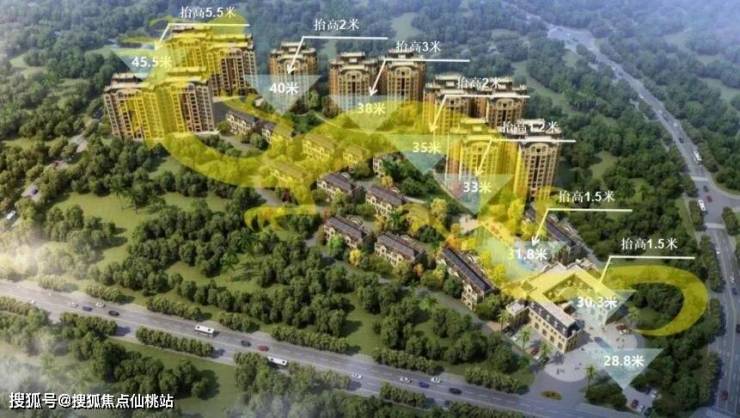 榕树广场到喷泉抬高1.5米,喷泉到泳池抬高1.5米,泳池到沙滩游乐场抬高2米,沙滩游乐场到5号楼抬高5米,5号楼到8号楼抬高7米,累计升高17米,相当于6层楼高度;