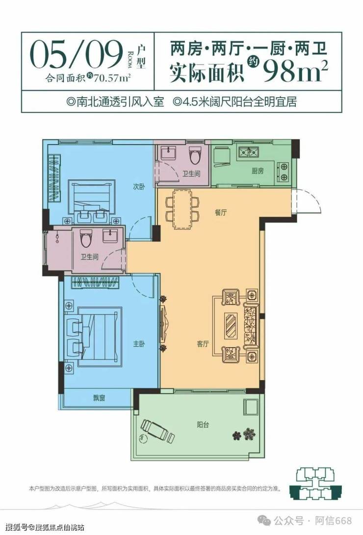 1、建筑面积70㎡ ,使用面积98平米
