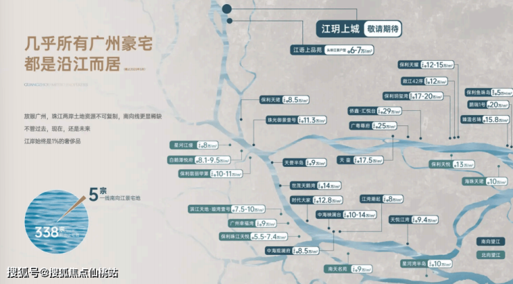 【占据 1% 稀缺资产】⼴州今年⼟地拍卖 338 宗地块,仅有 1% 是⼀线南向江景住宅,珠江两岸⼟地资源不可复制,南向线更显稀缺,江岸始终是 1% 的奢侈品。