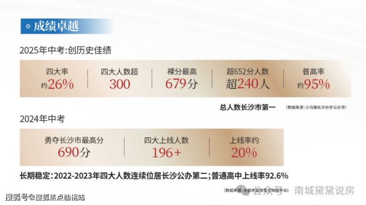 根据拿地协议,润和天心序可配套入读长郡外国语实验中学南校区,小学就近入读长郡外国语实验中学附属小学,带名校双书包,贯通式培养,孩子未来培优、拔尖更具优势。郡外有多牛,可能湖南老乡都了解, 2025年中考成绩创下历史新高:四大名校录取人数超300人,四大率达26%,普高率高达95%,多项指标位列全市第一,已比肩长郡双语等顶尖公办。