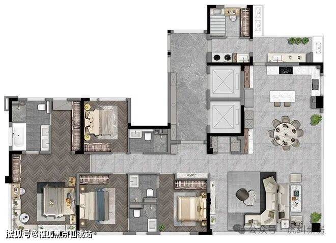 186㎡户型,主卧配置浴缸、双台盆设计、办公书桌,按照酒店式套房来设计。加上转角飘窗,犹如五星级酒店体验感。