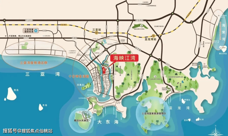 海映江湾项目位于河东路,北接迎宾路,南至鸿洲游艇码头,居三亚城市主干道解放路与凤凰路之间,距离三亚湾直线距离仅1.3公里,距离三亚汽车站约1.4公里,车程约6分钟,距离三亚凤凰岛约2公里,距离大东海旅游区约5公里,车程约13分钟,距离凤凰国际机场14公里,车程约37分钟。距离海棠湾约26公里,车程约40分钟。