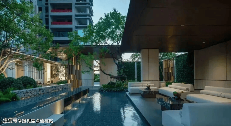 园林设计上,森系度假美学景观,公区质感跃级,优选石材、铝板、铝格栅等,入户大堂奢华感拉满。