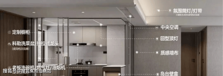入户赠送收纳功能强大的玄关柜,厨房天花采用石膏板+回型灯设计,客餐厅天花弧形吊顶、地面采用大地砖,造价更高、更耗时耗力,也更美观。