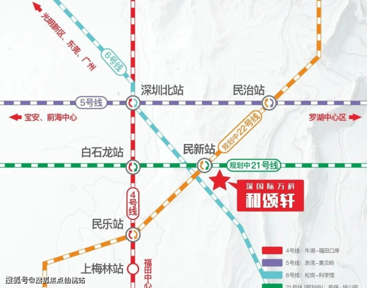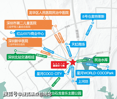 地铁-地铁线路密集: 1站深圳北,2站福田。4/5/6/21(规划中)/22(在建中)号线,5条地铁环绕;项目距离4号线白石龙站直线距离约600m,便捷通达;
