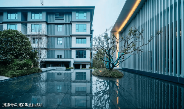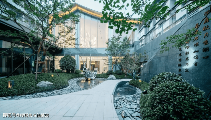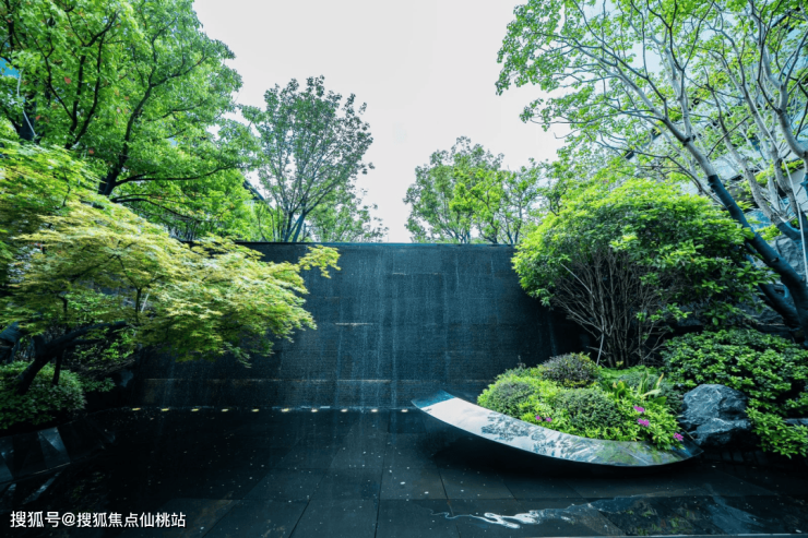 小区的整体营造远不止于绿植,更在于水、石、光影与建筑的有序搭配,共同构成完整的艺术系统。以入口景观为例,四层叠瀑拾阶而上,搭配整面福鼎黑斧凿面石材景墙,融合树、水、石、墙等元素,营造出风生水起、诗意祥和的饱满意境。穿行其间,即可感受风景与艺术的自然融合。