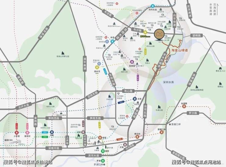 约200米直线距离到淘金山绿道,沿线共13个景观节点,起于翠湖社区公园,终至沙湾路,分为映彩华章、山林野趣、山湖叠翠和绿廊揽胜四个主题段,可俯揽深圳水库、远眺梧桐山。近邻求水山公园、樟树布公园,举步自然的浓荫谧静,成为家人休闲栖息目的地。