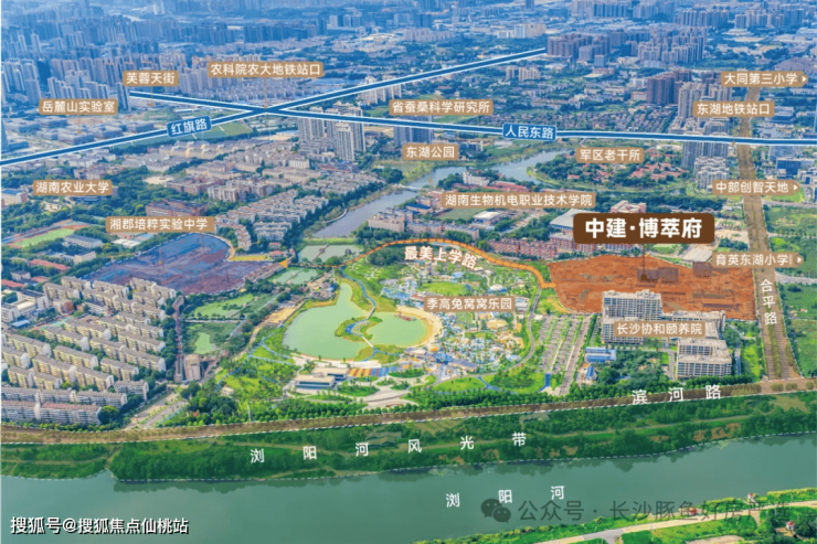 学校:配套入读湘郡培粹隆平校区一校两址本部(2026年开学),小学为大同三小。实际上中建博翠府距离中学比桃李一期二期更近一点,步行约700m;