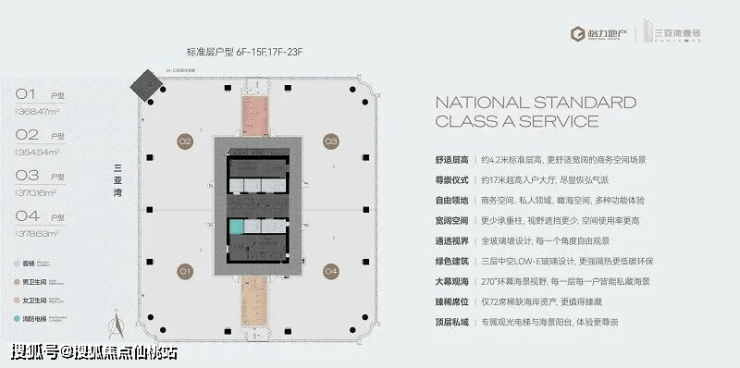 三亚湾壹号主楼约120米高、270°稀缺海景写字楼。产品类型有建筑面积约352㎡-374㎡商务资产(6F-15F,17F-23F);建筑面积约1596-1682㎡顶层资产(24F-27F),仅72席。公共区域精装交付,套内毛坯交付,由戴德梁行提供定制高端物业服务。