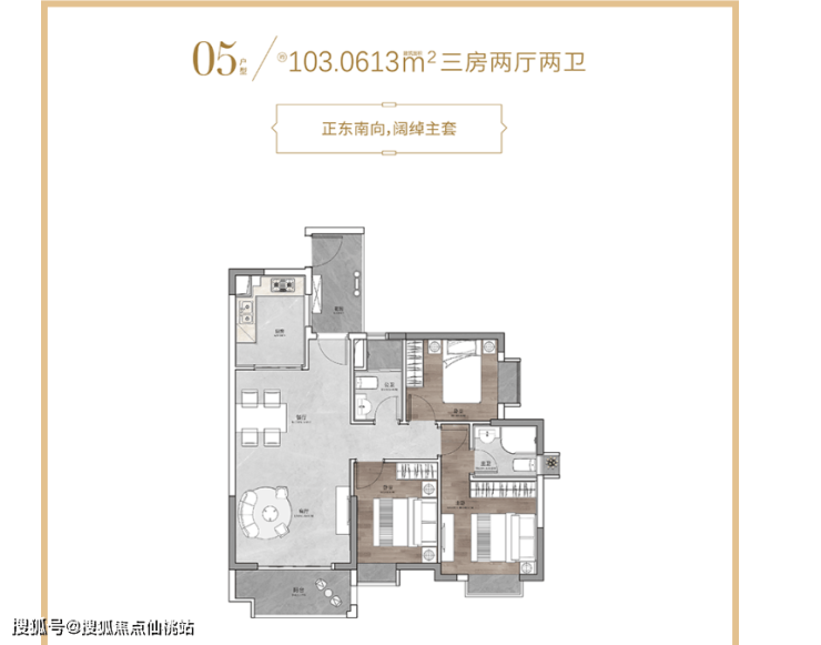 最大的在售户型是 103㎡的 3 室 2 厅,总价在 336 万到 450 万元之间,不同楼层和朝向价格差异较大,这个户型的客厅面宽更宽,阳台也更大,部分房源能看到远处的街景,适合有老人同住的家庭。