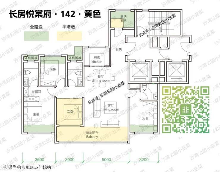 这个户型在2栋,是临占南侧赤黄路的楼栋,占比不多,仅有9.2%。配置上仅有2卫,但倔强的长房设计师依然给了五房的配置,而且这个第五房真的特别特别小。(园长醉了)这个面积释放给客餐厅不好吗?主要原因还是核心筒设计的太迷惑,本来用个剪刀梯就能解决的问题,非要拉个连廊。这个户型还有另一个槽点就是面宽,总面宽仅有11.9m,客厅开间5m,三开间,这个真的是上个版本的142了。想买142的尽量不要选这户。
