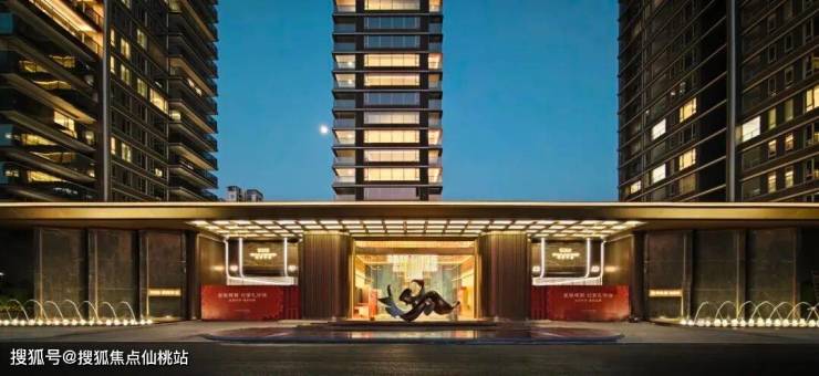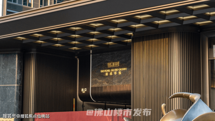 酒店式落客区,搭配艺术大师张代松定制的雕塑《潮涌向前》、玺纹水景与香槟金线条勾勒,这是从门面到“艺术展”的蜕变。约66米长、8米高的奢阔门庭,更具备高度对称的秩序感,让华玺担得起“佛山豪宅门王”的称号。